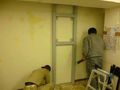 造作されていた間仕切りの強度に不安があり、壁掛け金具だけでは危険な為新たにベースとなる柱を造作。