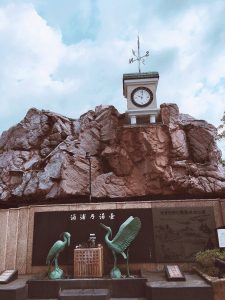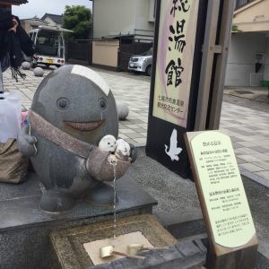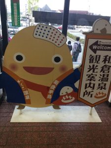 ↑和倉温泉のゆるキャラ“わくたま君”がお出迎え。