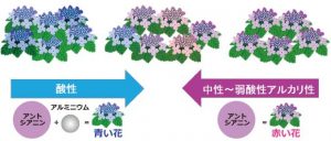 酸性の土の場合は、土に含まれるアルミニウムが酸の影響を受けて土壌に溶け出している状態の為、これを根っこから吸収した紫陽花の花びらは化学反応の結果青く変化する、