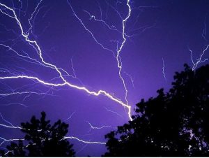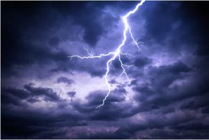 上昇気流が発達した低気圧や台風によって形成された雷雲から生じた雷。