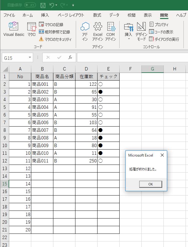 iの値が13になったとき、No.13の商品名が空欄のため、繰り返し処理を抜けて最後のメッセージを表示します。