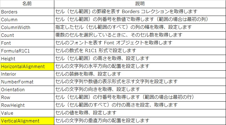 ■セル(Rangeオブジェクト)のプロパティ一覧(よく使われるものを抜粋)