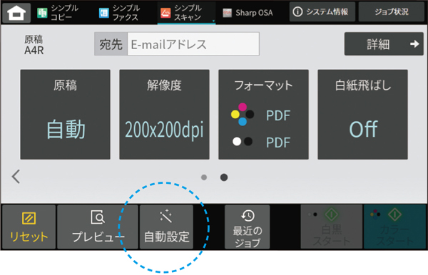 スキャンのシンプルモードでパネルの「自動設定」キーをタップすると、解像度や原稿の天地判定、白紙飛ばし機能などを自動的に設定。AIも活用した解像度/階調数/圧縮率の自動的な判定により、時間と手間をかけずに、原稿に最適な設定でスキャンできます。