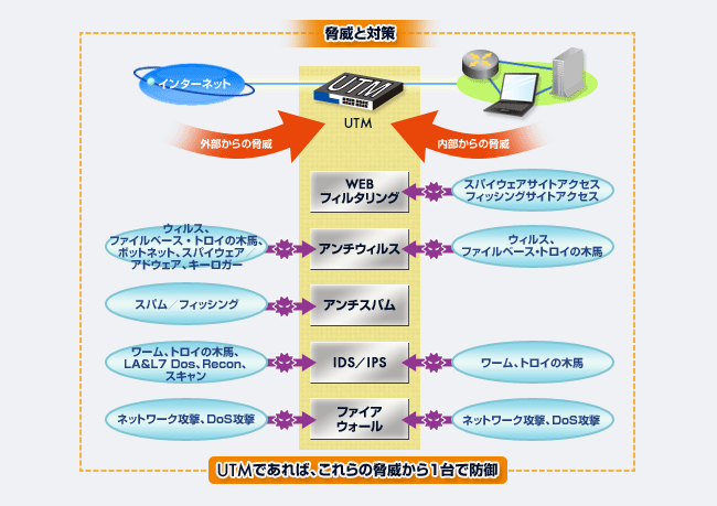 様々な脆弱性を攻撃してくるワームやウイルスなど、企業ネットワークは新たな脅威にさらされています。この脅威に対抗するためには、ファイアウォールのみならず、IDS/IPSやアンチウィルス、アンチスパム、Webフィルタリングなどを駆使し、総合的なセキュリティ対策を施さなければなりません。しかし、複数の機能を導入・管理していくには、手間もコストも積み重なります。そこで、これらのセキュリティ機能を集約したのがUTMです。このような複合的なセキュリティ対策をゲートウェイに施すことによって、管理・運用負荷の低減とネットワーク脅威管理の一元化を実現します。