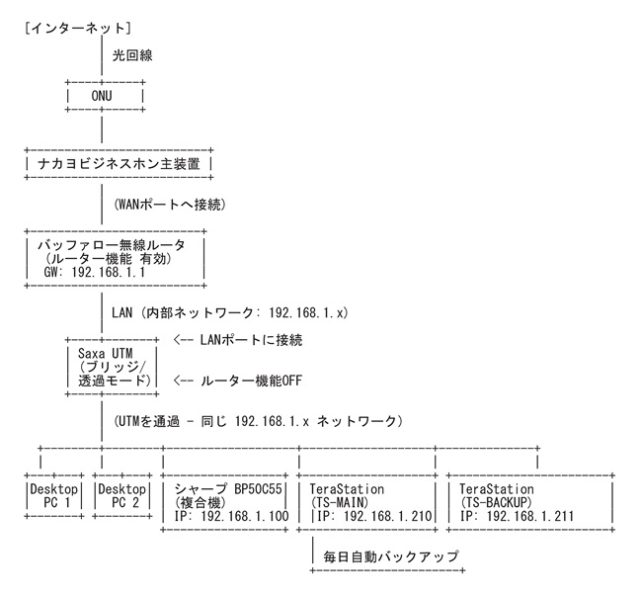 ブリッジでバッファロー無線ルータへ接続されその下にsaxaUTMが接続