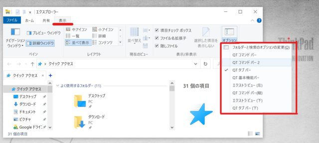 ③.エクスプローラーひらく→表示→オプションを順番に選んで、QTTabBarのバーリストが出できます