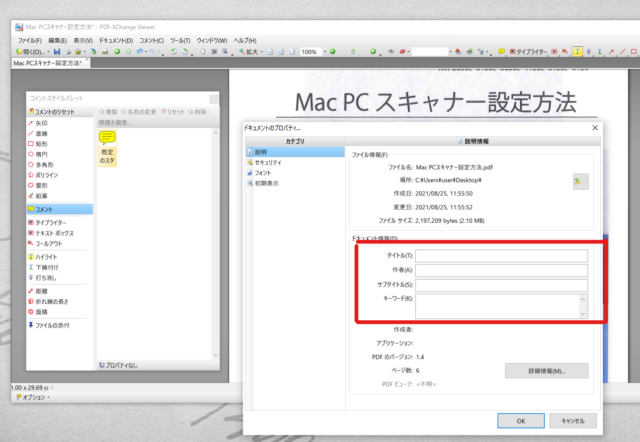 ②.表示された「ドキュメントのプロパティ」をクリックしたら「ドキュメントのプロパティ」の画面が表示されます。この画面からドキュメン情報を設定することができます